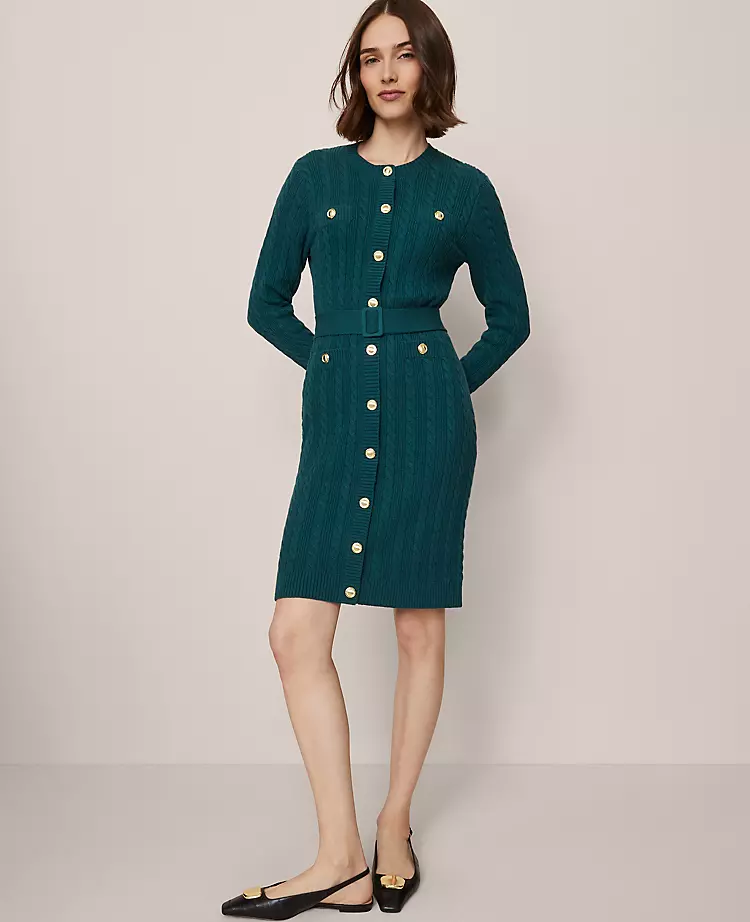 Designed with a flattering belt, this sophisticated cable sweater dress offers the perfect textural appeal to your everyday. Round neck. Long sleeves. Front value closures. Adjustable belt. Ribbed cuffs and hem.