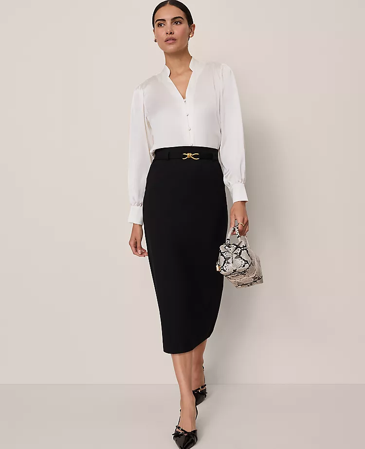 Cinched with a polished buckle belt, this sleek ponte skirt is designed in a streamlined silhouette. Belt loops. Adjustable buckle belt. Hidden back zipper with hook-and-eye closure. Lined.