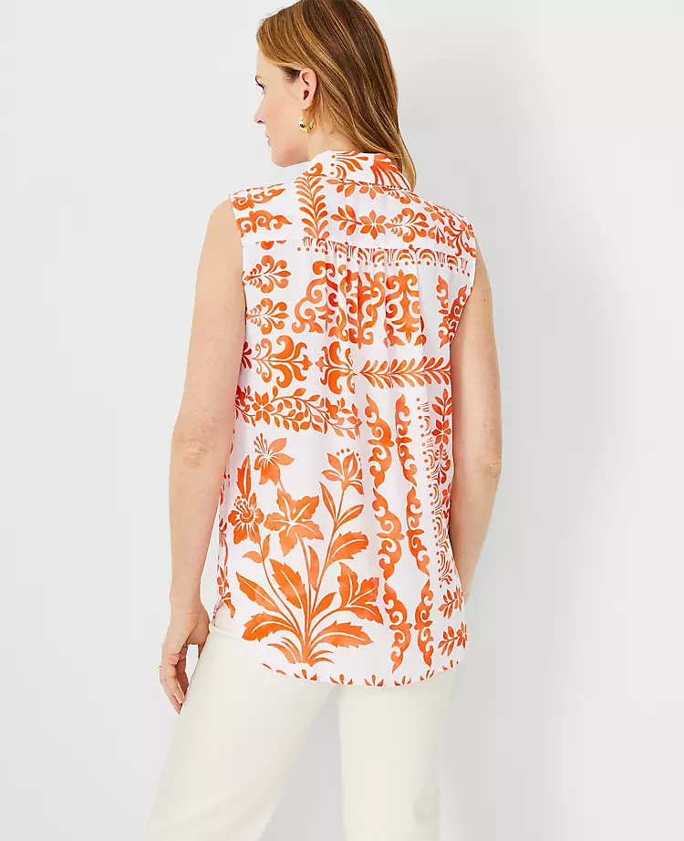 We’ve updated our camp shirt with a covered button front and extra shirring, for a fluid and streamlined silhouette that works anywhere. V-neck with point collar and pleat below. Sleeveless. Chest patch pockets. Shirred forward shoulder seams and back yoke. Shirttail hem.