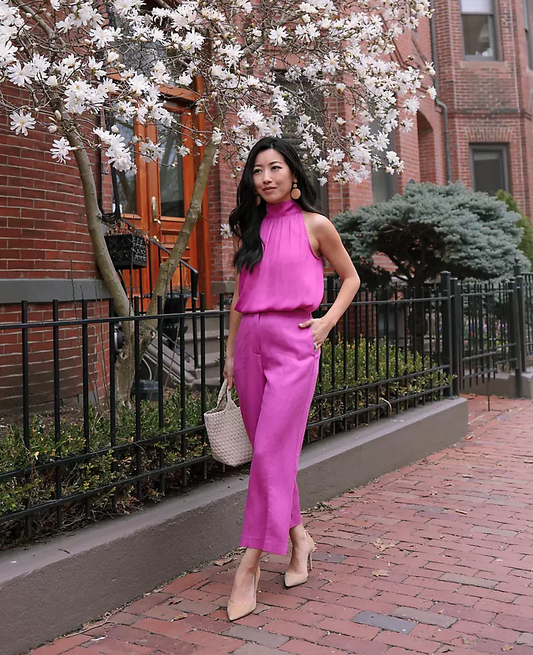 Tied as a bow at the front, back or side – or even worn loose in front – this smartly cut halter top pulls it all together in endless ways. Shirred stand collar with ties. Back slit with button closure.