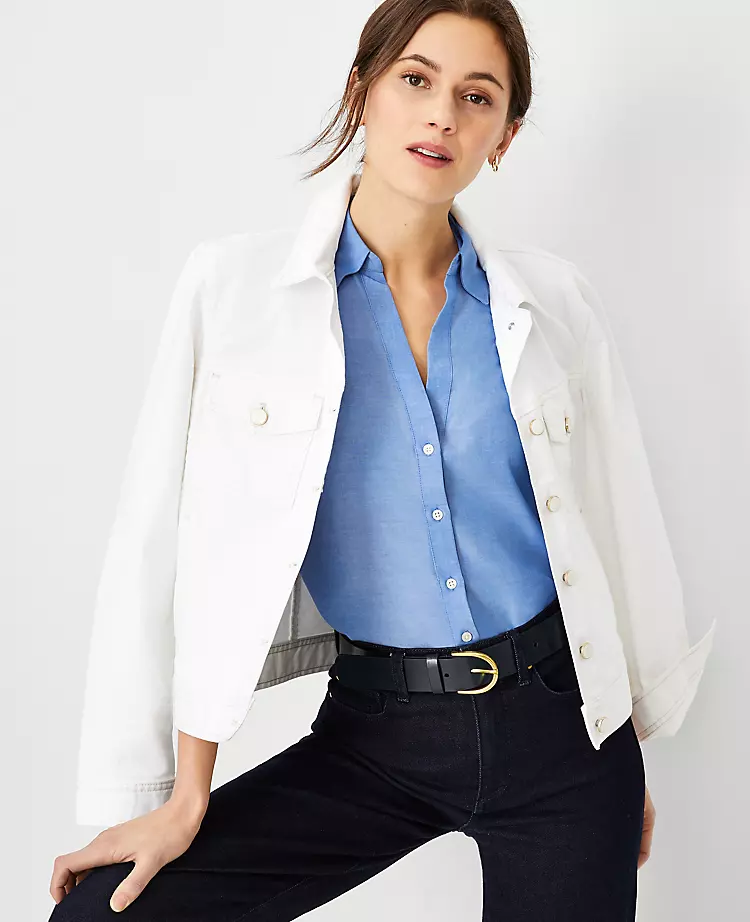 With a slim fit and a bit of drape, count on this one every time you go to your closet. Point collar. Sleeveless. Button front placket. Back yoke. Shirttail hem.