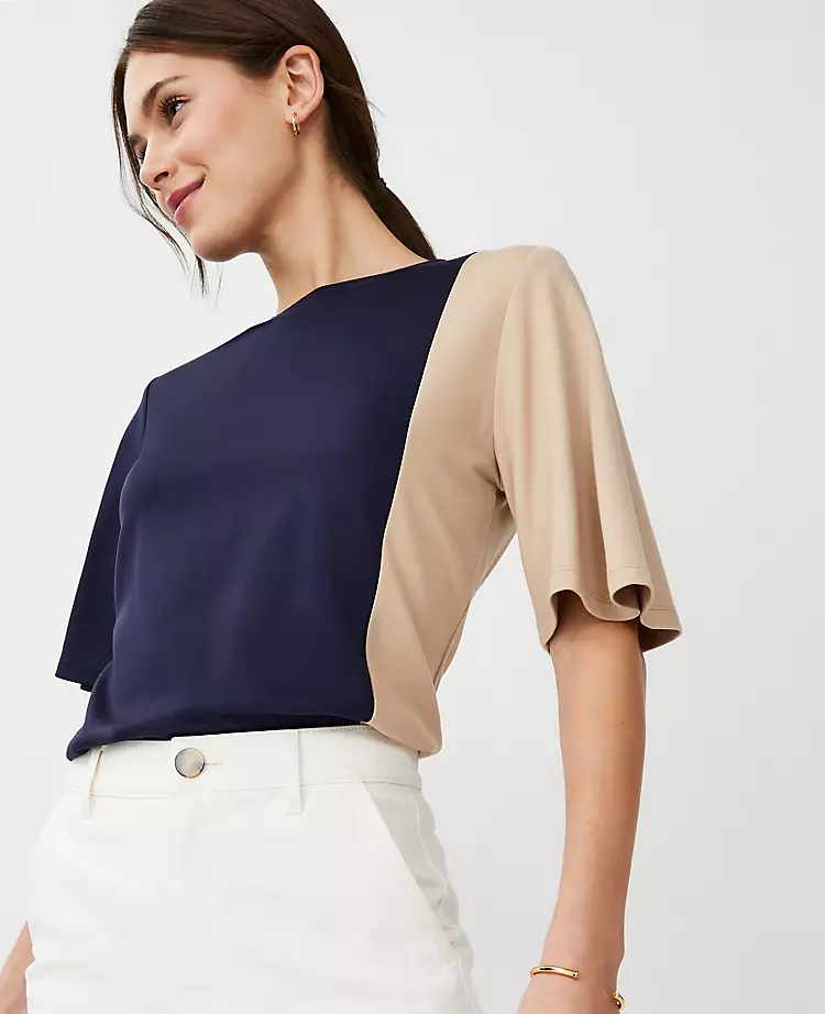 Designed with smart contrast color, our ponte knit top is modern, clean and graphic. Crew neck. Elbow sleeves.