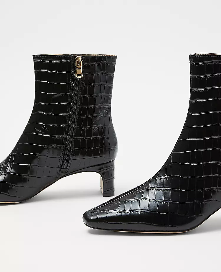 Expertly crafted, our luxe blade heel booties take your look to new heights. Padded footbed for complete comfort. 5 3/4″ shaft height with 5″ circumference. 3″ heel.