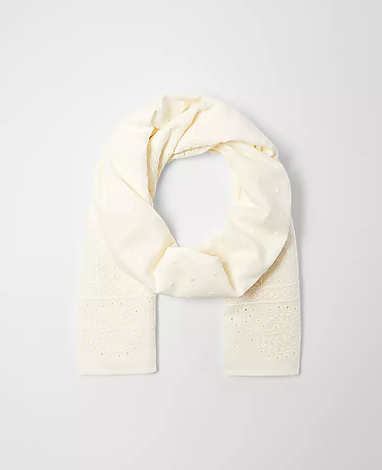 Our embroidered scarf weaves a romantic thread that elevates any outfit. 32″ x 76″.