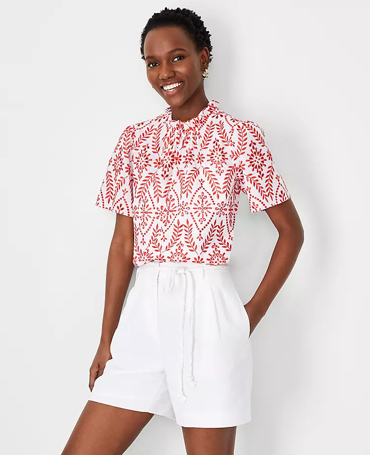 Add an air of romance with this eyelet mock neck top, crafted in pure cotton. Shirred ruffle mock neck. Short sleeves with shirred sleeve caps. Back slit with button closure. Lined.