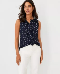 A cascading drape lends modern fluidity to this knit and woven shell. Jewel neck. Sleeveless. Hidden button front placket. Back yoke. Woven front and back yoke. Knit back body.