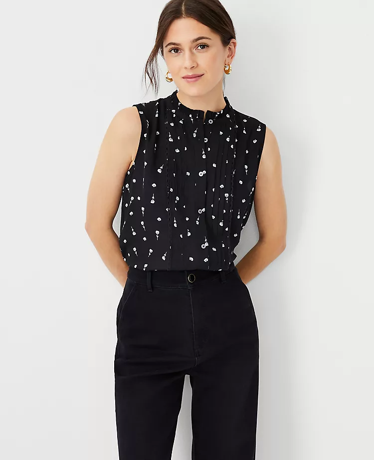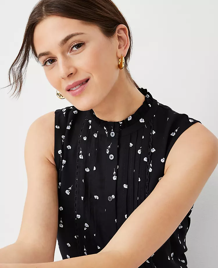 Romantic ruffles paired with pretty pintucks equals feminine perfection – in a knit and woven mix. Ruffle crew neck. Sleeveless. Button front. Front pintucks. Woven front. Knit back.