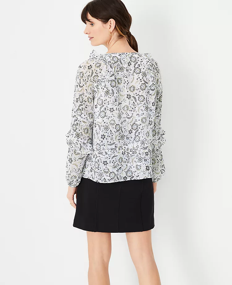 Romantic ruffles paired with pretty pintucks equals feminine perfection – in an irresistibly charming mix. Shirred jewel neck with front slit and button closure. Long raglan sleeves with shirred sleeve caps and elasticized cuffs. Lined body.