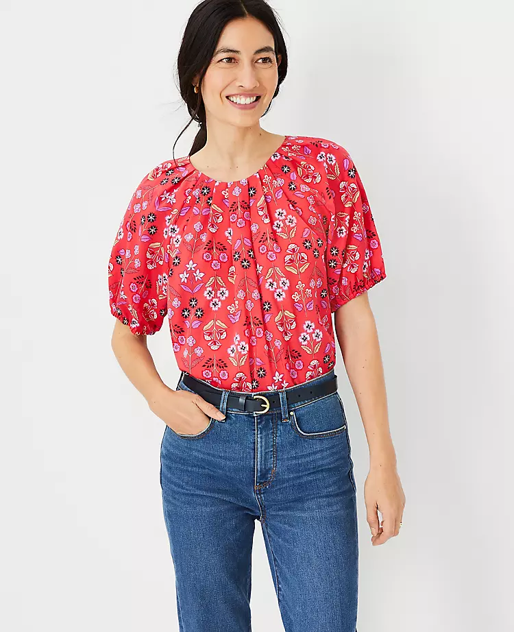 Between the pretty pleats and refined texture, this woven top is effortlessly polished. Pleated jewel neck. Short raglan sleeves with elasticized cuffs. Back keyhole with button closure.