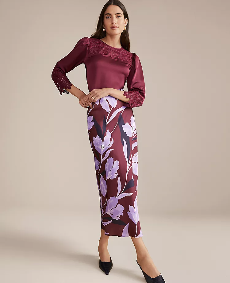 Our bias midi slip skirt flatters in a softly flared pull-on silhouette. Elasticized waist. Lined.