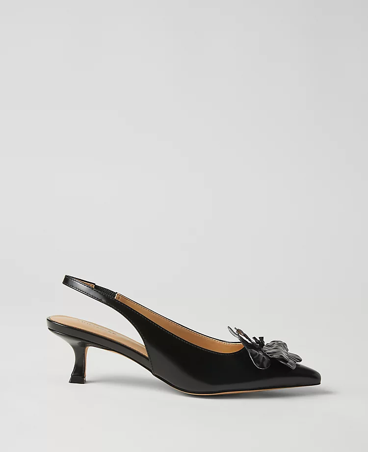 Florals cover these sleek leather slingbacks for a modern step into romantic style. Padded footbed for comfort. 2” heel.