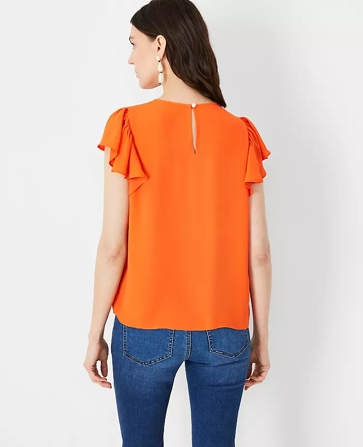 Flounce sleeves add an alluring lift to this shirred neck top, done in fresh seasonal colors. Shirred jewel neck. Flounce ruffle sleeves with shirred shoulders. Back keyhole with button closure.