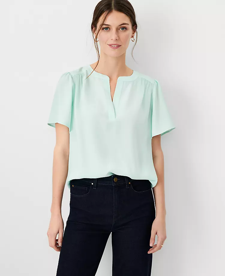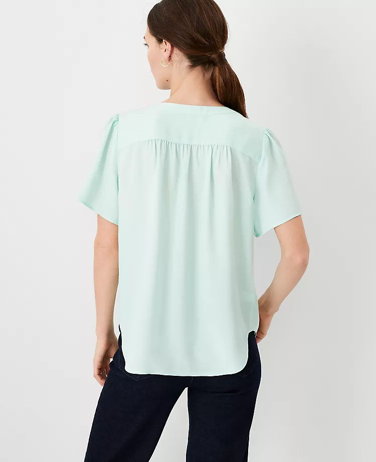 We’ve paired an easy popover style with breezy flutter sleeves, for a modern play on everyday dressing. Split neck. Short flutter sleeves. Shirred forward shoulder seams and back yoke. Shirttail hem.