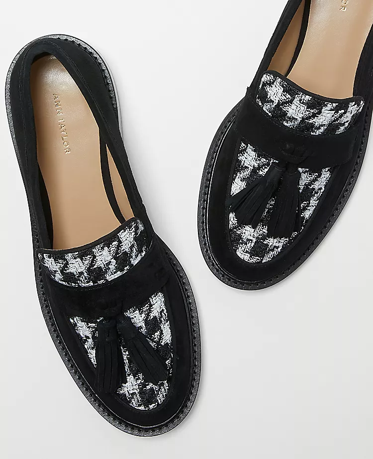 Embellished with stylish tassels, our buttery suede houndstooth loafers put you a step ahead. Padded footbed for complete comfort. 1/2″ heel.
