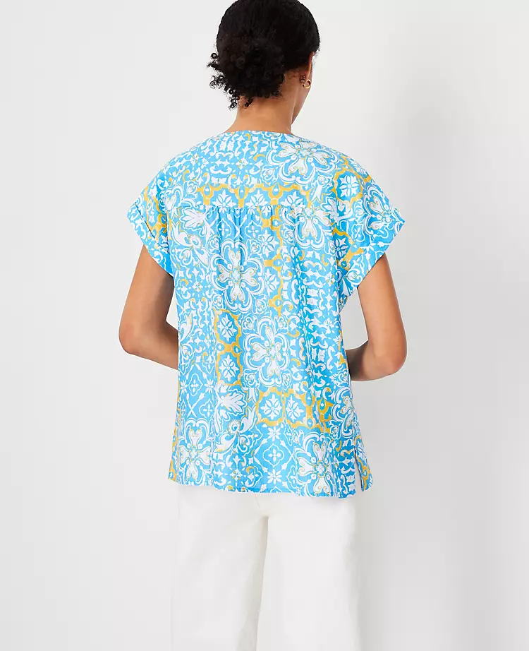 With a flattering drop shoulder silhouette, this linen popover is one of the season’s easiest (and most relaxed) toppers. Jewel neck. Dolman cap sleeves. Button front placket. Shirred forward shoulder seams and back yoke. Side slits.