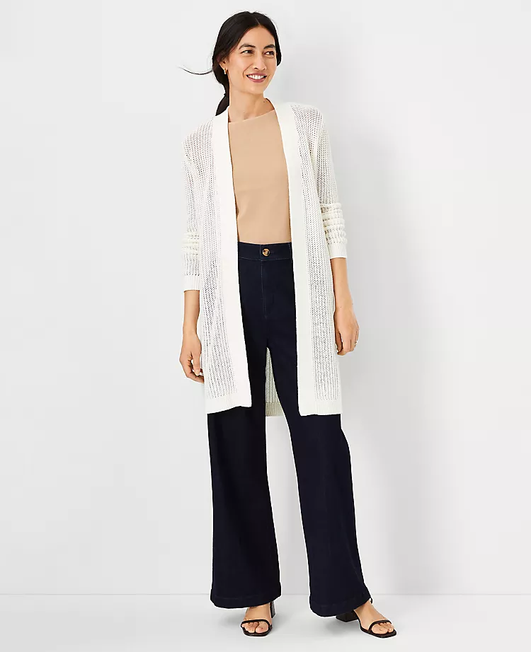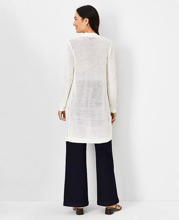 In a relaxed silhouette, our mesh stitch open cardigan is destined to be a warm weather favorite. Open front. Long sleeves.