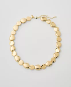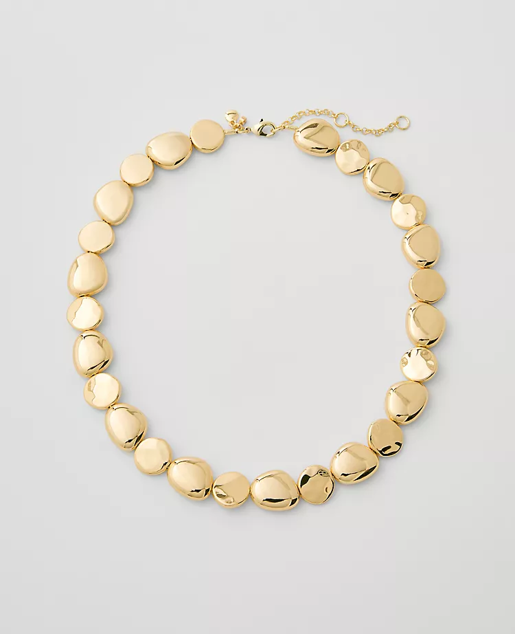 This metal multi-disc necklace updates ensembles with artful aesthetic and shine.