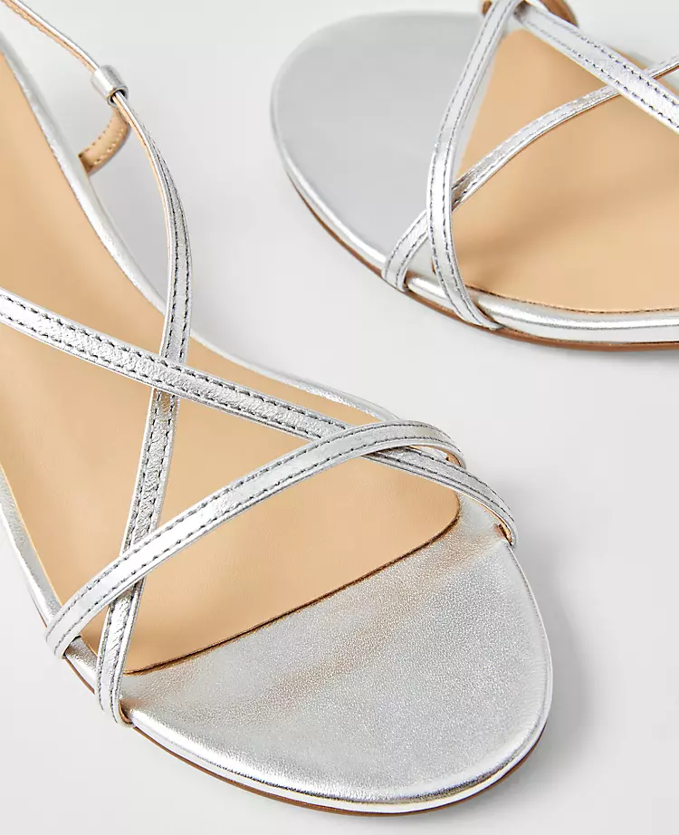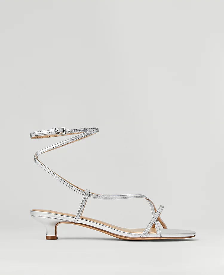A strappy ankle-wrap design imbues these metallic kitten heels with flattering glamour. Padded footbed for comfort. 1 1/3” heel.