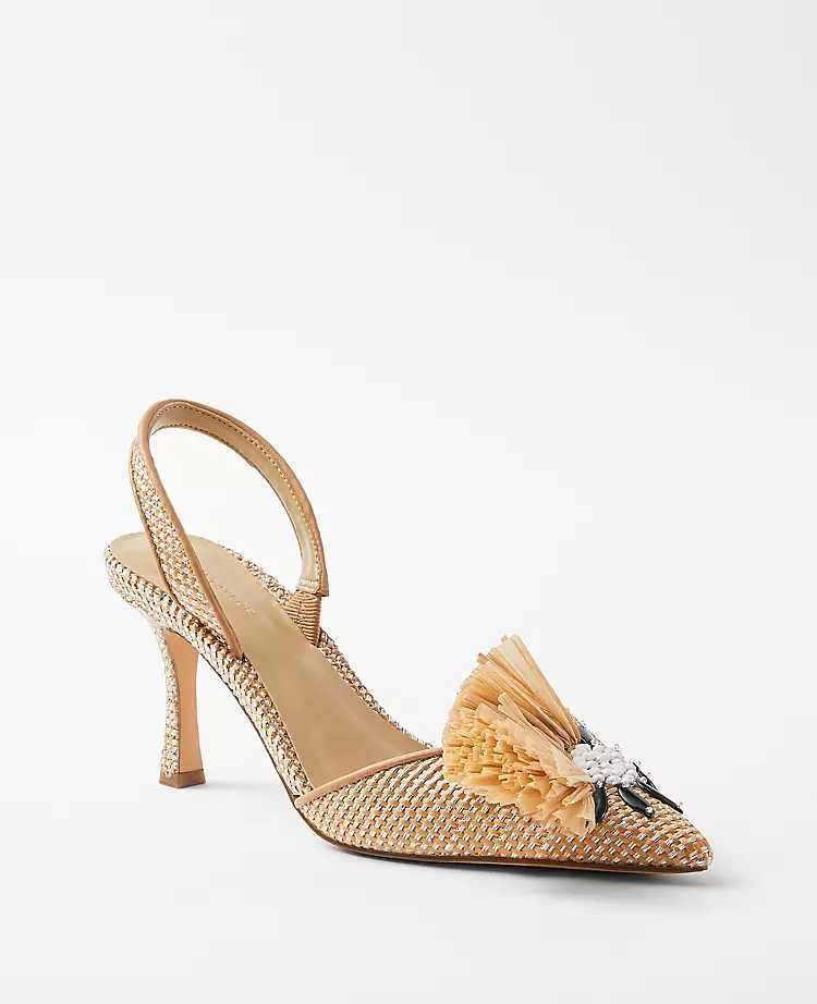 Woven for natural texture, our entrance-making embellished straw slingback pumps are infused with a hint of metallic sheen. Pointy toe. Padded footbed for complete comfort. 3″ heel.