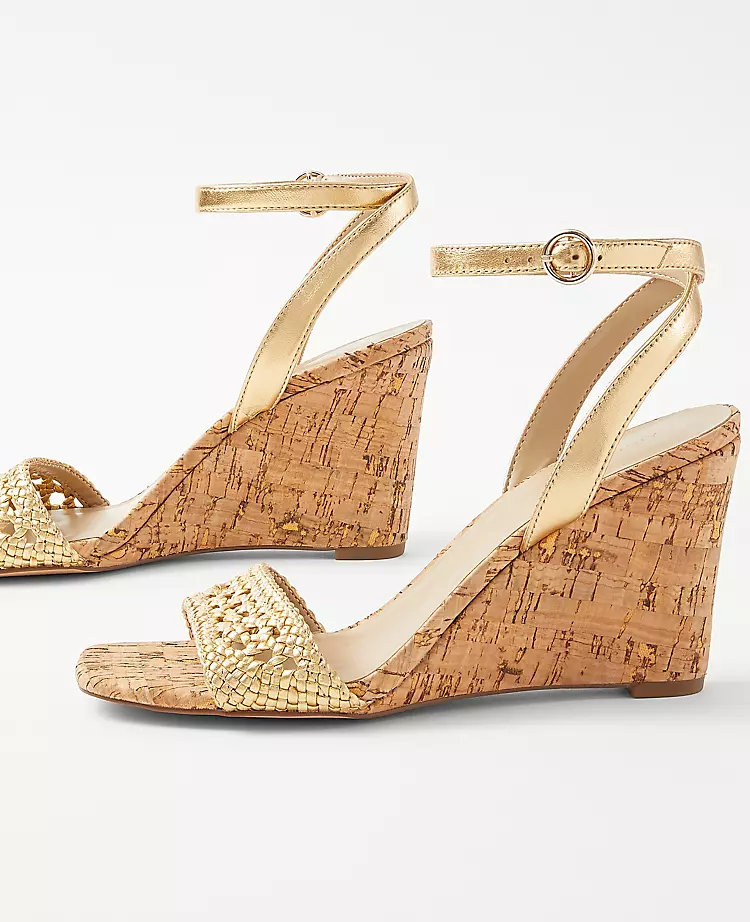 Woven with natural texture, our metallic leather wedge sandals put a little spring in your step. Open toe. Adjustable side buckle for secure fit. Padded footbed for complete comfort. 3 1/4″ heel.