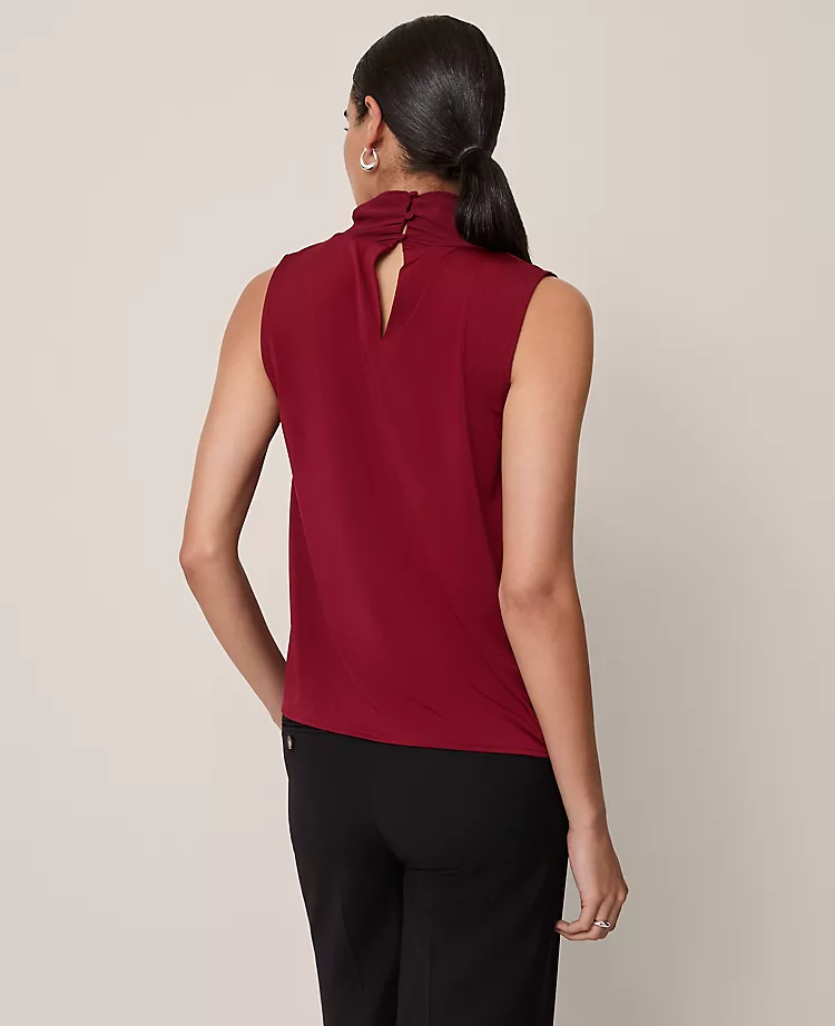 Designed with a woven front and knit back, this chic draped cowl neck blouse can be worn under blazers or on its own. Cowl neck. Sleeveless. Back slit with value closures.