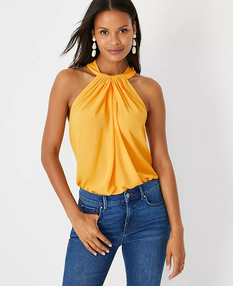 Beautifully draped with a knotted neckline, our mixed media halter flatters from day to night. Pleated halter neck. Back slit with button closure. Woven front. Knit back.