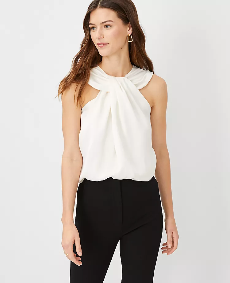 Beautifully draped with a knotted neckline, our mixed media halter flatters from day to night. Knotted neckline. Collar with front shoulder pleats. Hidden back zipper with hook-and-eye closure. Woven collar and front bodice. Knit back bodice.