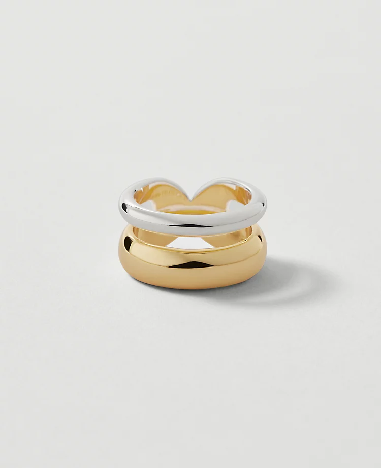 This silver and goldtone ring creates a chic stacked look that will complement your other treasured pieces.