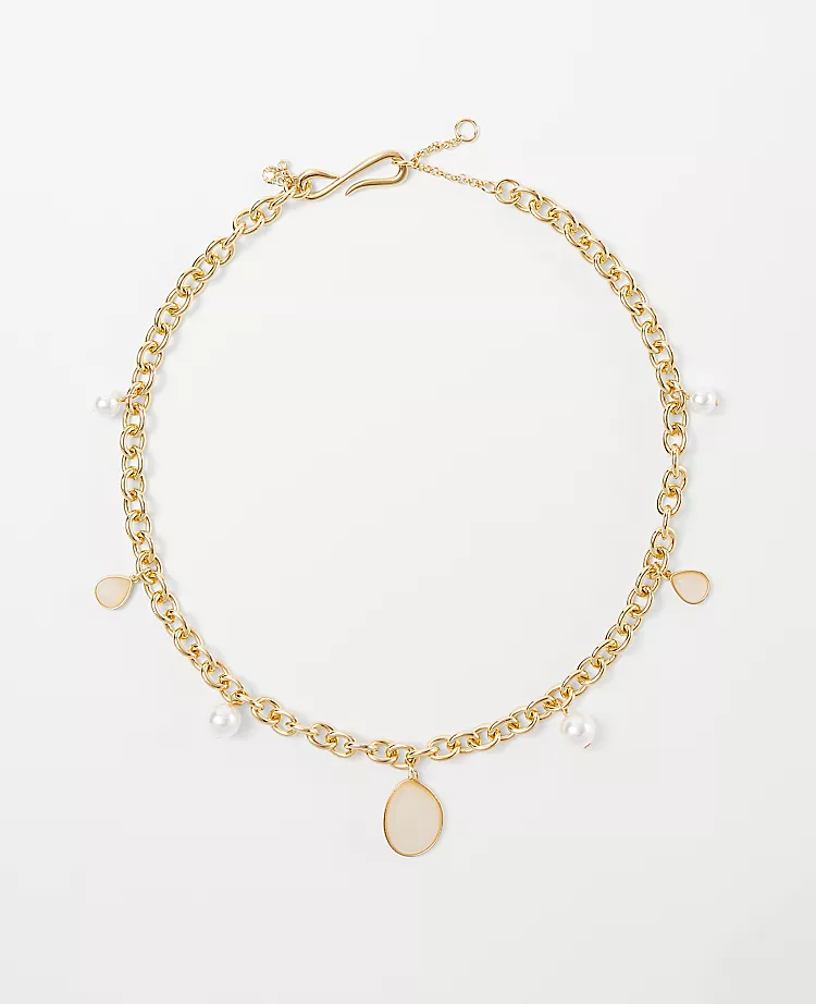 Glossy and lustrous, our pearlized charm necklace makes a polished finishing touch. Hook closure. 18″ long.