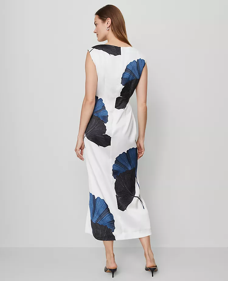 Soft pleated detailing gives this timeless midi dress a beautifully sculpted silhouette. Boat neck. Sleeveless. Hidden back-zip closure. Lined