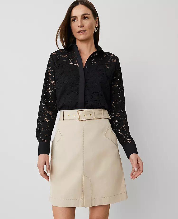 Utility-inspired details stamp this polished and flattering skirt with a touch of modern attitude. Belt loops with adjustable buckle belt. Side welt pockets. Hidden back-zip closure.