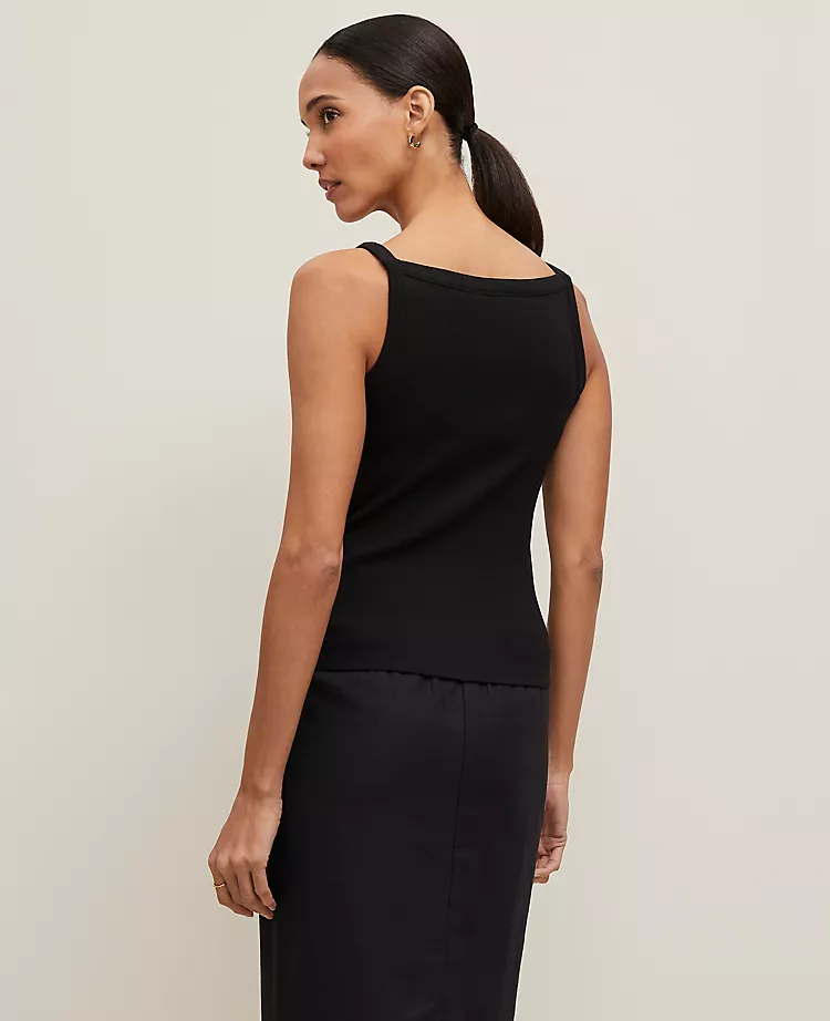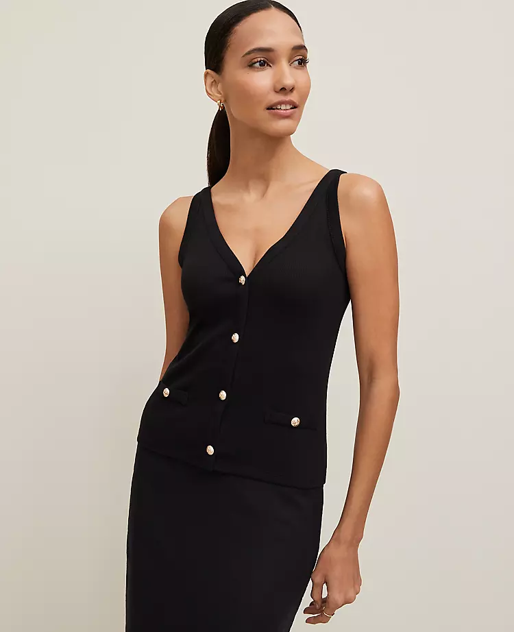 This soft knit racerback tank is beautifully textured and incredibly flattering. V-neck. Front value closures. Spaghetti straps. Front value welt pockets. Racerback.