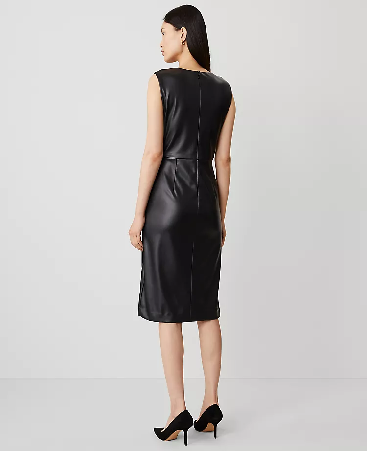 Designed with an artfully draped skirt, this luxe faux leather sheath is one of our sleekest looks. Crew neck. Sleeveless. Hidden back zipper with hook-and-eye closure. Lined body.