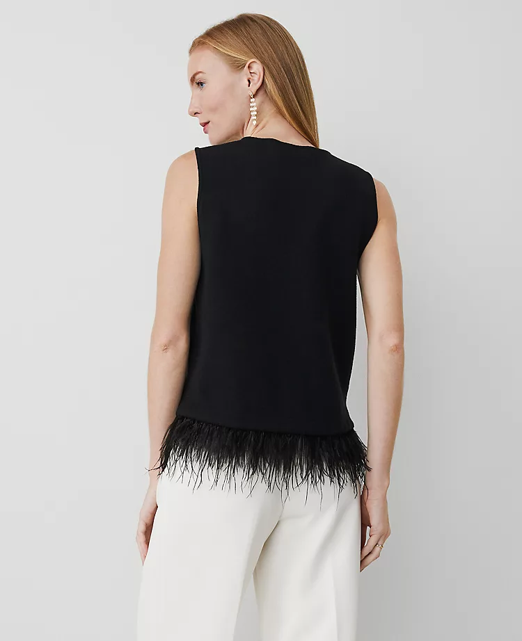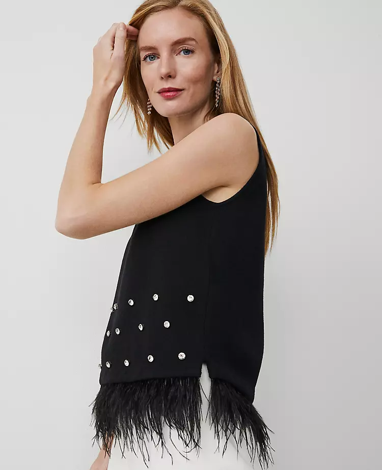 Finished with a feathery hem, our embellished shell sparkles with polished rhinestone detail. Crew neck. Sleeveless. Side slits.