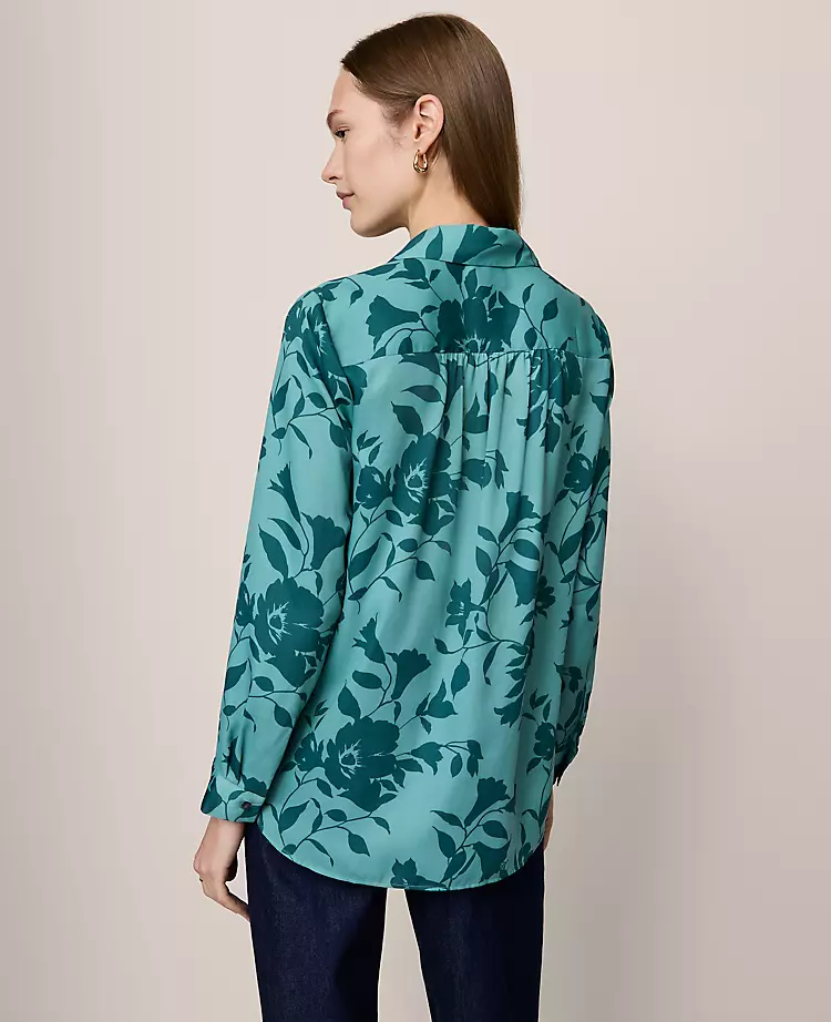 We’ve updated our camp shirt with a covered value front and extra shirring, for a fluid and streamlined silhouette that works anywhere. Point collar. Long sleeves with value cuffs. Hidden-value front placket with pleat beneath. Front flap patch pockets. Shirred front shoulder seams and back yoke. Shirttail hem.
