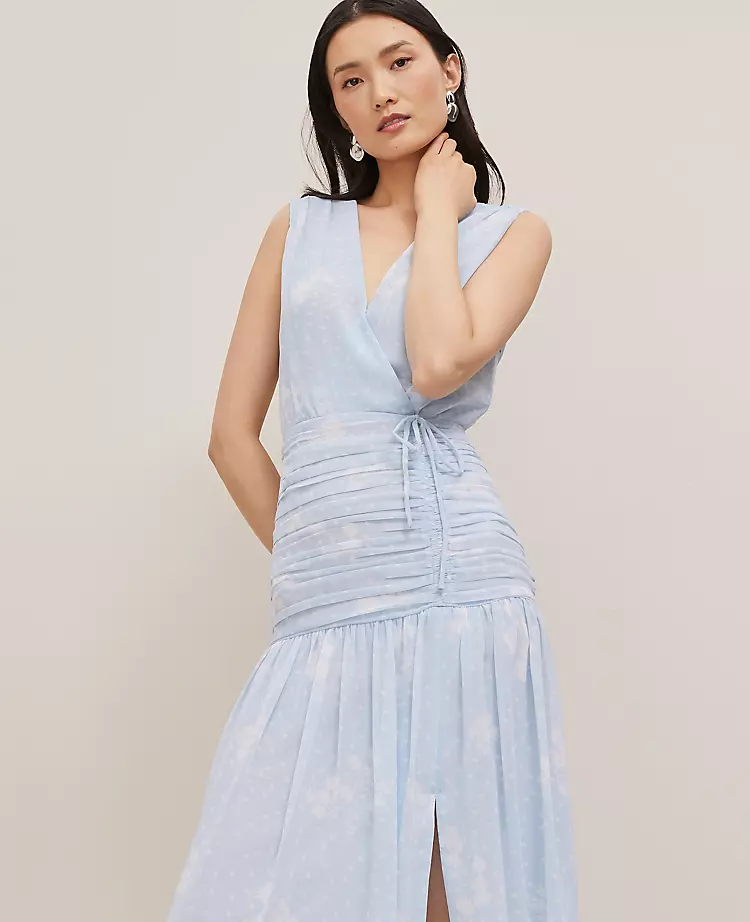 With an hourglass-enhancing ruched waist and fluttering split skirt, this chiffon flare dress is sure to make an entrance. V-neck. Sleeveless. Ties at side waist. Hidden side-zip closure. Side slit. Lined.