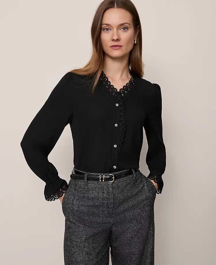 Delicate ruffle detailing enhances this equally romantic and feminine blouse. Split neck. Front-value closures. Long sleeves with elasticized cuffs.