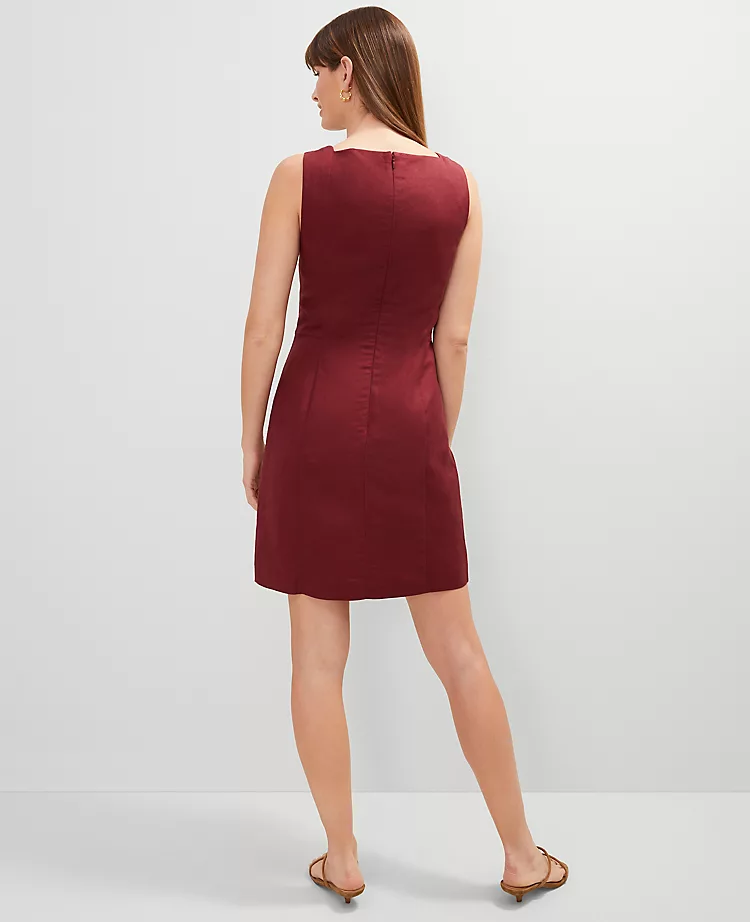 Details like a square neck and value front punctuate the polished silhouette of this beautifully tailored and modern dress. Square neck and back. Front value closures. Sleeveless. Hidden back-zip closure. Lined.