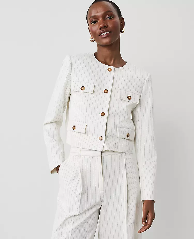 In precise pinstripes, our crew neck jacket features clean lines and polished value details. Round neck. Front value closures. Long sleeves. Four value welt chest pockets. Lined.