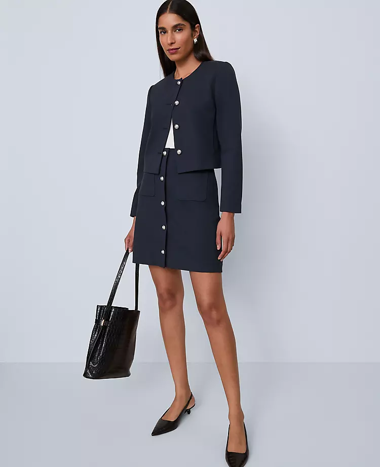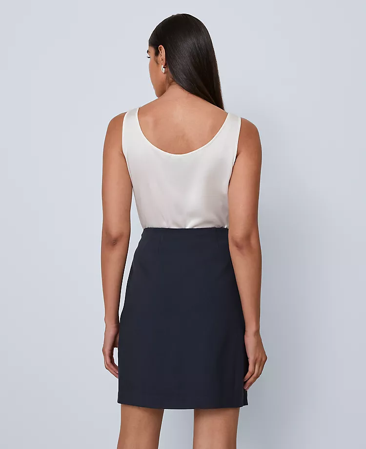 Done in sleek ponte, this chic A-line skirt is equally versatile and elevated. Front patch pockets. Back welt pockets. Hidden side zip with hook-and-eye closure.
