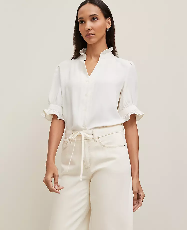 Ruffles frame this polished, fluid blouse with a touch of romance. Stand collar. Front value closures. Short puff sleeves with value cuffs. Shirttail hem.