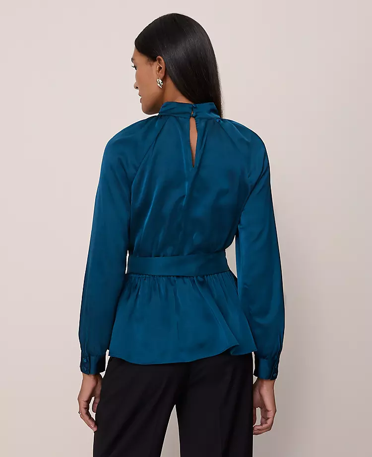 This feminine blouse is embellished with a flattering tied waist for an artful appeal. Mock neck. Long sleeves with valueed cuffs. Back valueed keyhole.