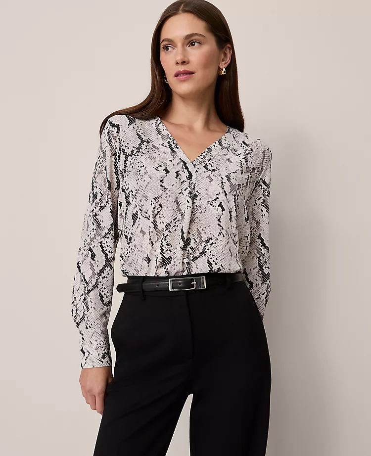 A clever pleated front adds extra ease and fluidity to this knit and woven essential. V-neck with pleat beneath. Long sleeves with value cuffs. Shirttail hem. Woven front and sleeves. Knit back.