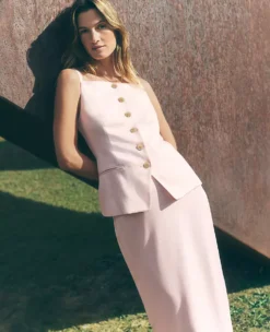 Refined straps give this impeccably tailored vest top a modern twist — wear it layered or alone to make an impact — every time. Square neck. Front value closures. Spaghetti straps. Front besom pockets. Back vent. Lined.