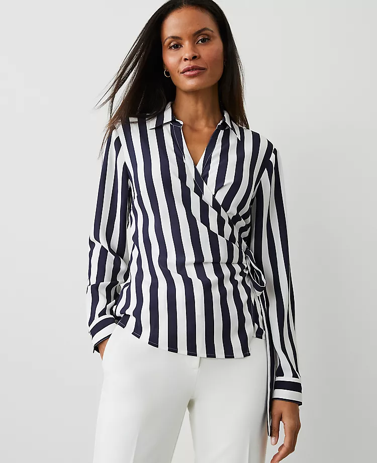 This fresh blouse is beautifully wrapped and draped for flattering defined waist effect. V-neck with point collar. Front value placket. Long sleeves with value cuffs. External and internal ties at side waist.