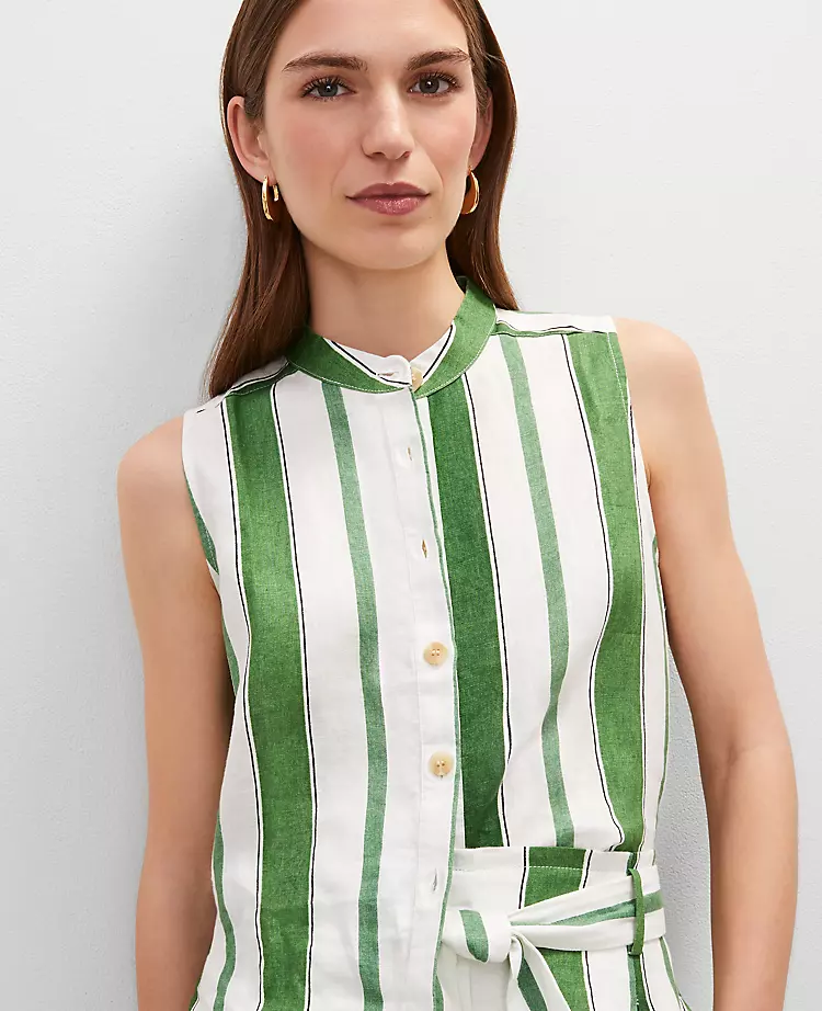 A true closet staple, this striped tank is made from airy linen that moves with you effortlessly. Stand collar. Front-value closures. Dropped shoulders. Sleeveless.