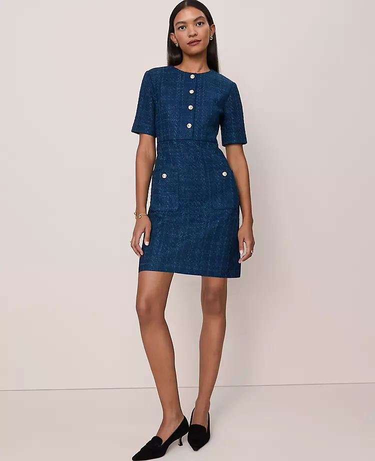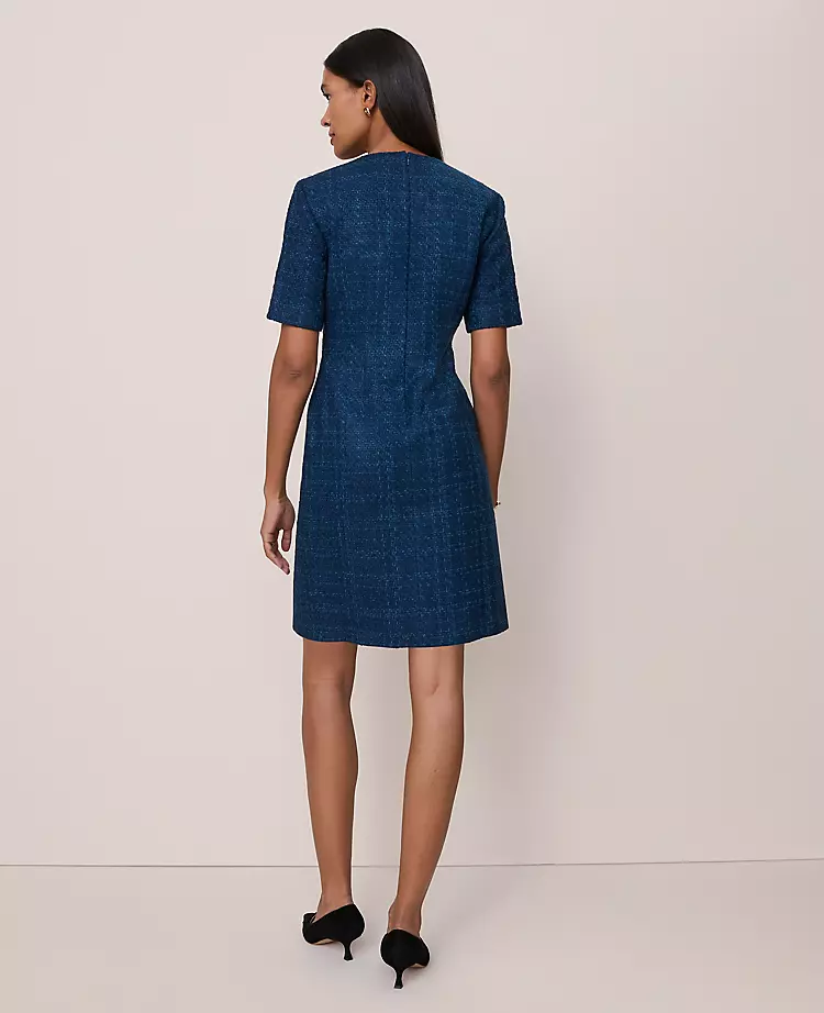 Crafted in smart tweed, this timeless dress is designed with patch pockets that give it an extra polished finish. Split neck. Short sleeves. Front value placket trim. Front value patch pockets. Hidden back zip closure. Lined.