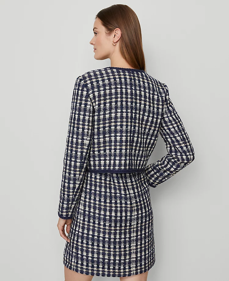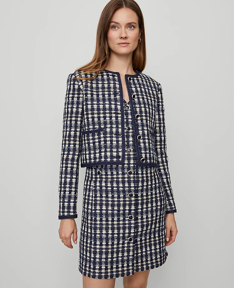 Trimmed with delicate embroidered detailing, this sophisticated tweed jacket radiates a fresh and feminine feel. Crew neck. Front-value closures. Long sleeves. Front patch pockets. Lined.