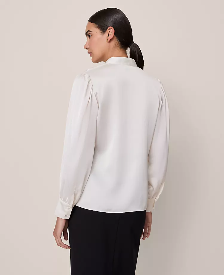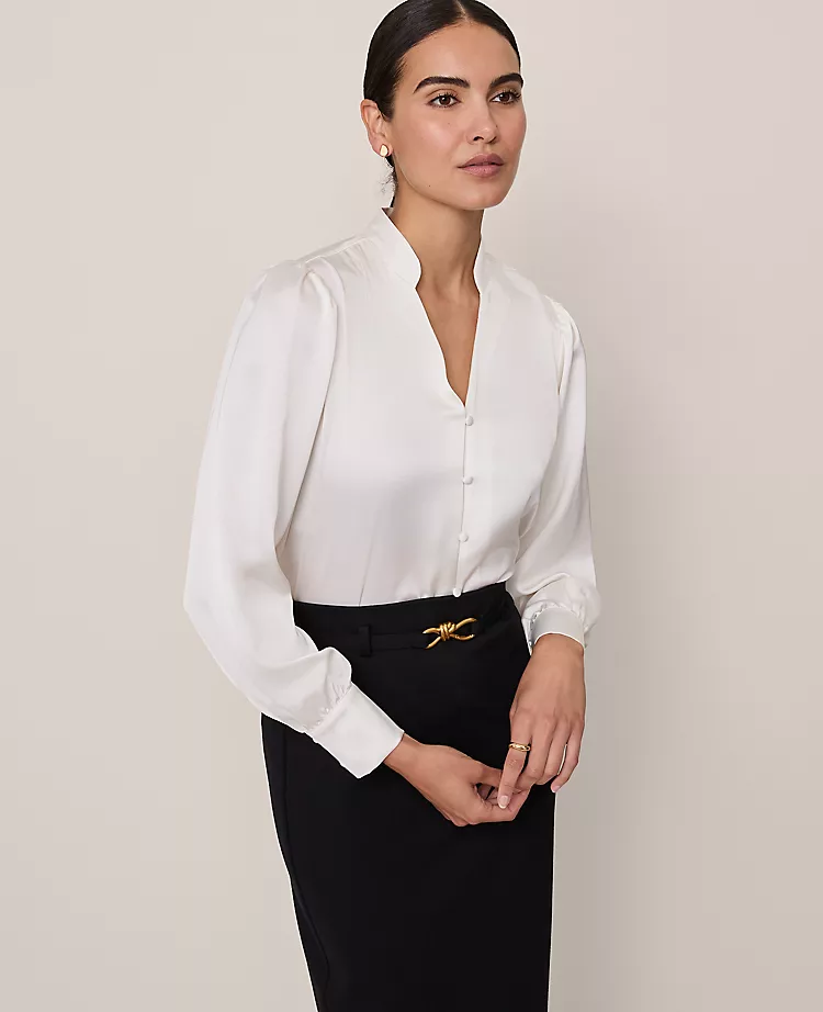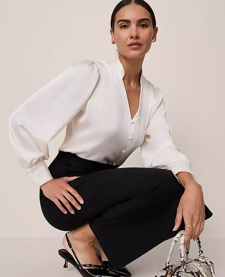 Framed with blouson sleeves and a flattering V-neckline, this flowing blouse is both polished and versatile. V-neck with tab collar. Front value closures. Long sleeves with puff shoulders and value cuffs. Shirttail hem.