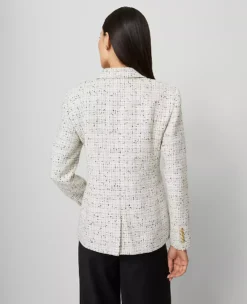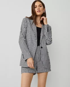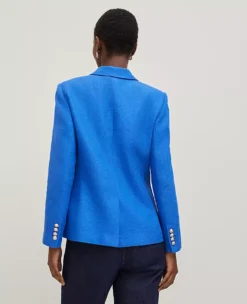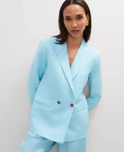 The Petite Relaxed Double Breasted Long Blazer In Linen Blend Gulf Stream Blue